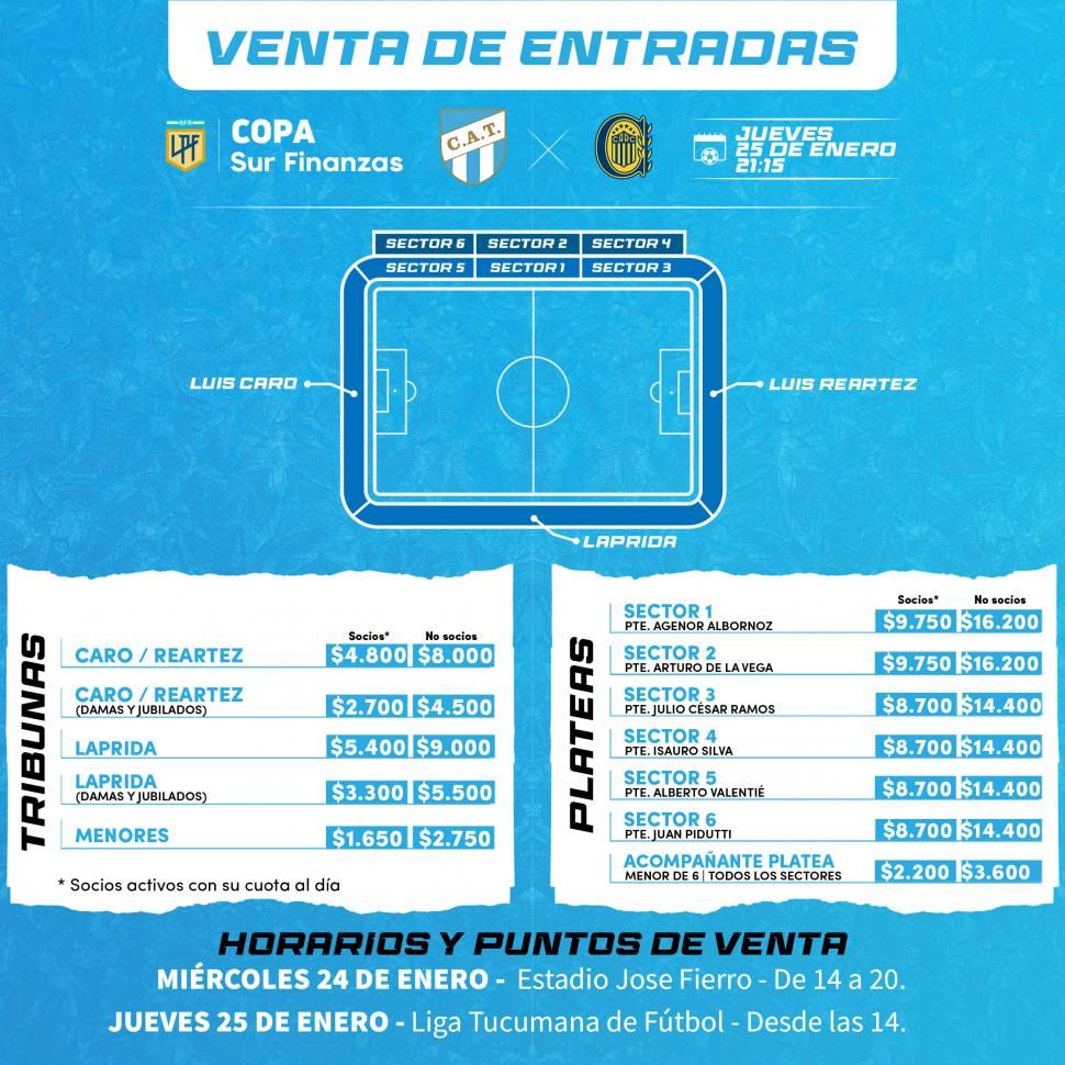 La venta física comenzará el miércoles 24 de enero, de 14 a 20, en el Estadio José Fierro, y continuará el jueves 25, a partir de las 14, en la Liga Tucumana. Los siguientes son los valores establecidos para cada uno de los sectores: